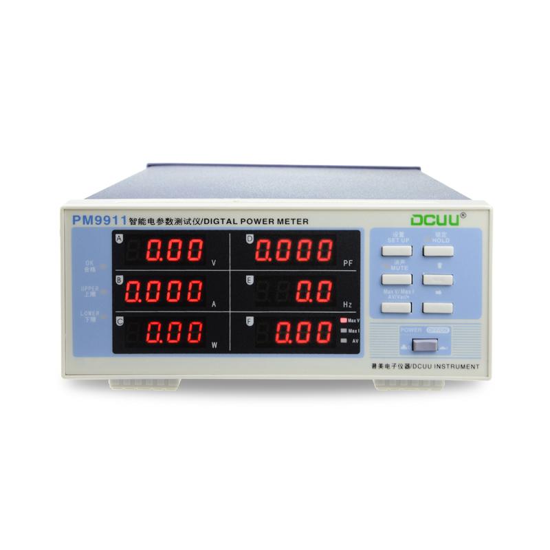 PM9911智能电参数测量仪是集电压测试、电流测试、功率测试、功率因数测试、频率测试于一体的多功能测量仪,除基本电参数测量功能外,又增加峰值电压、峰值电流、有功功率、无功功率测试。具备电流、功率上下限设定、判别及报警功能,避免传统人工判别带来的疲劳、误判、低效等问题。广泛应用于照明电器、电动工具、家用电器、电机、电热器具等领域生产企业的生产线、实验室和质检部门。