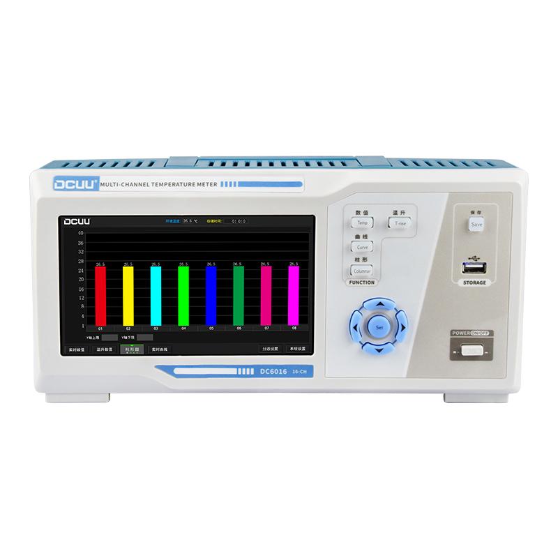 DC600系列多路温度记录仪可分为8通道、16通道、24通道、32通道、48通道,用户可根据需求进行选择。 本仪器采用7寸液晶屏,支持J型、K型、T型热电偶,可同时对多路温度数据采集,具备读取实时数值、温升数值、柱形图及实时曲线,也可将数据记录在U盘内部,仪器支持设置上下限,具备报警和数据传输,仪器显示丰富、操作简单,性能稳定,精确可靠、高性价比。